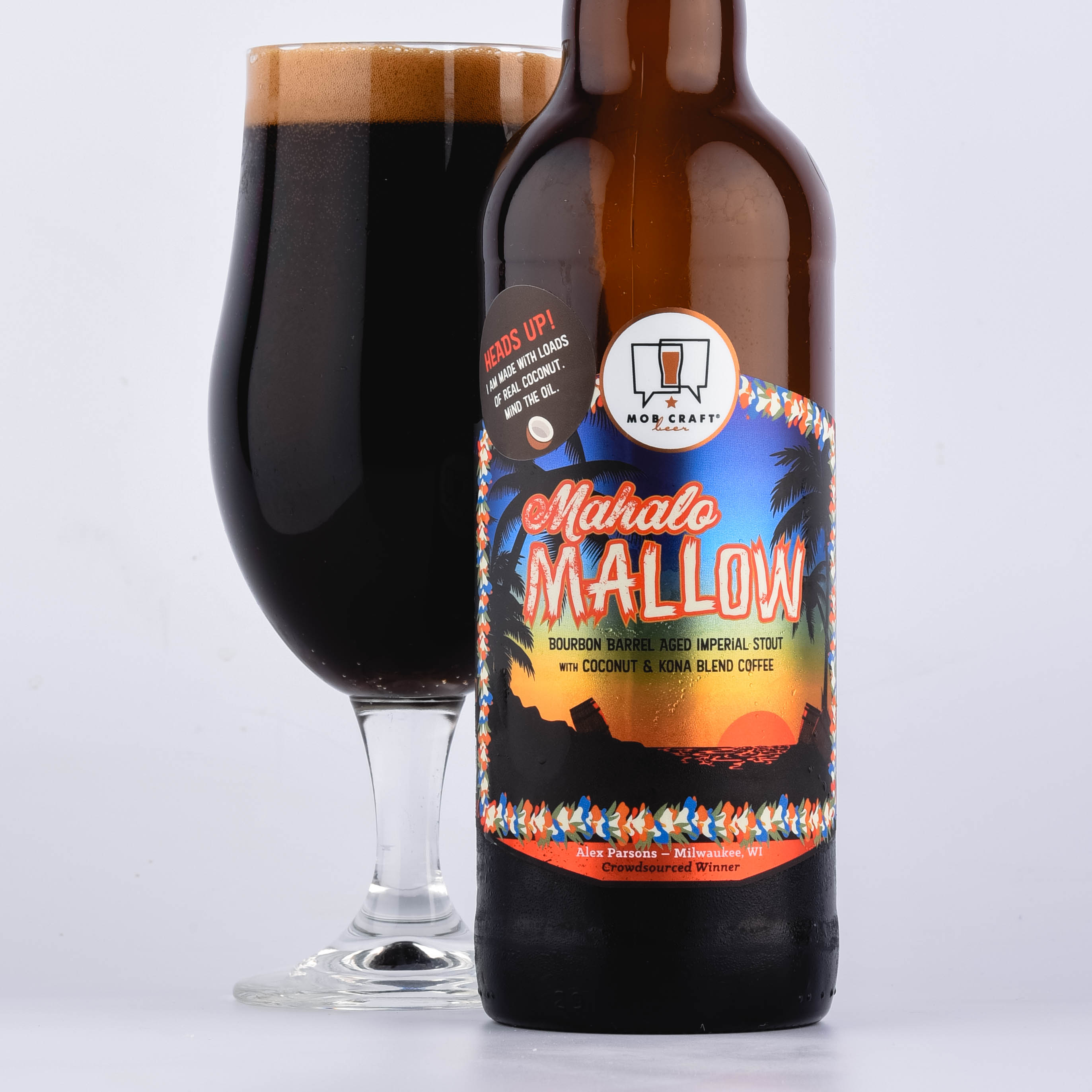 Just like they did with today’s Mahalo Mallow — a decadent Imperial Stout brewed with real Kona Blend coffee, coconut, and a sprinkle of cinnamon and aged for a year in Bourbon Barrels!