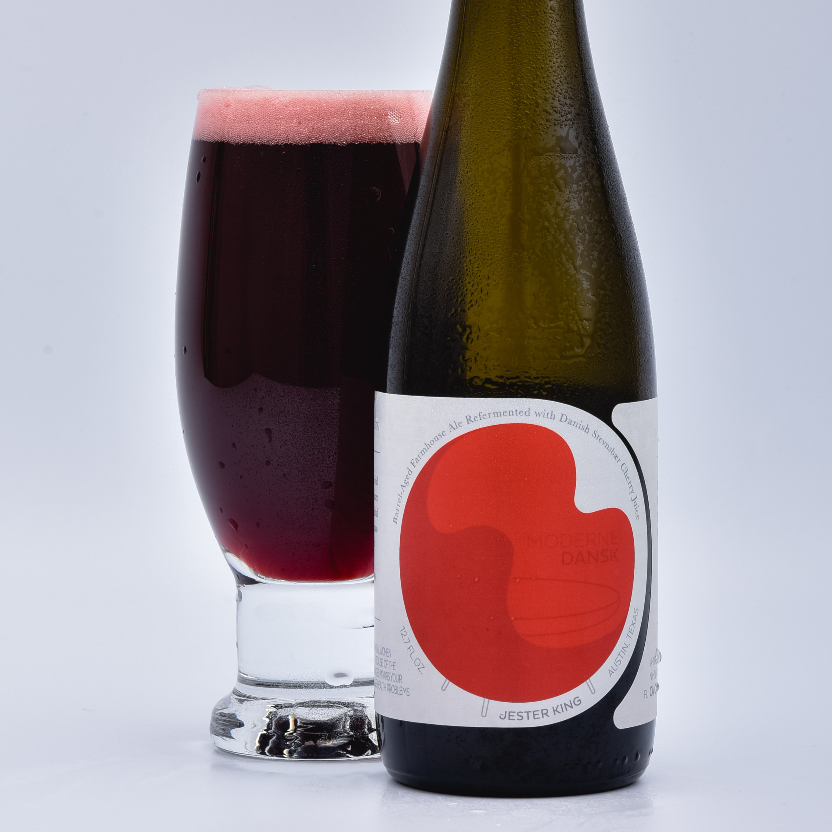 To make Moderne Dansk, Jester King started with a blend of hops, local grain and pure well water. Then, they fermented it with native yeast and house mixed culture. Finally, they aged it in oak barrels, and re-fermented it with Stevnsbaer cherry juice.