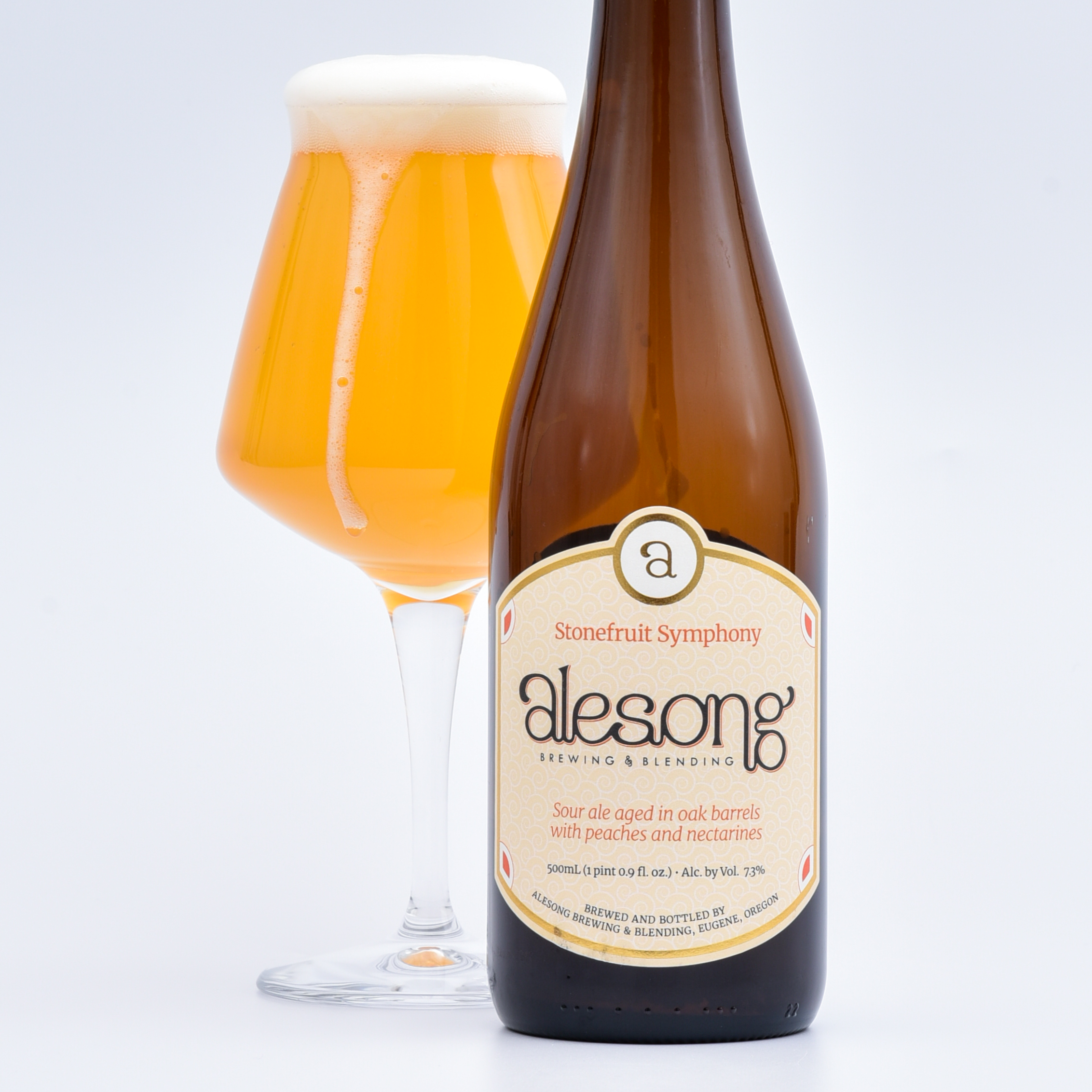 A rising crescendo of succulent peaches builds waves of lush, tangy flavor. Honeyed notes of dark and light-fleshed nectarines rise up in a sultry, sweet harmony. The tangy, golden Sour base brings a bright, puckering staccato, smoothed out by the warm melody of American and French oak barrel-aging.