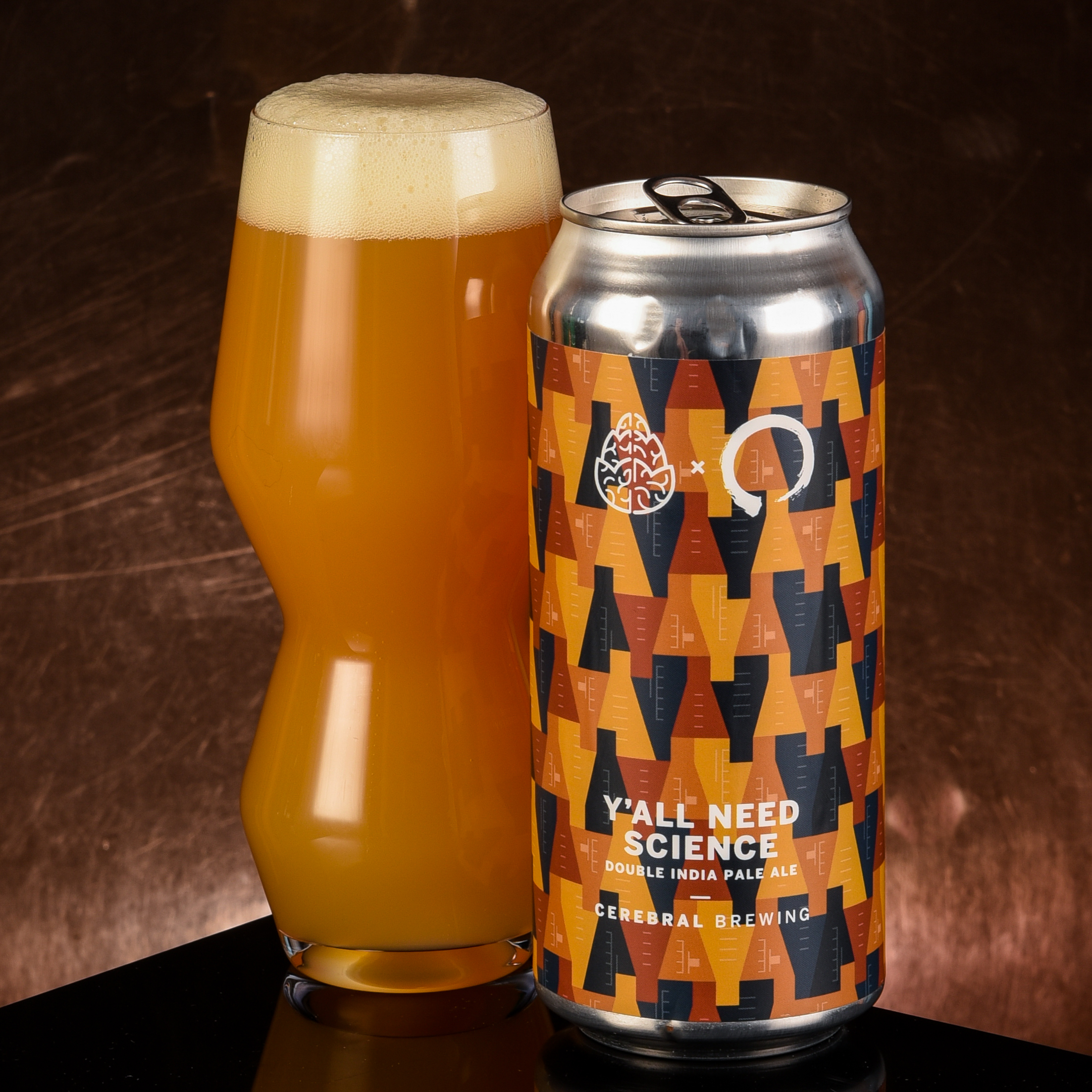 The frequent collaborators and real former scientists at Cerebral and Equilibrium teamed up on a plush Double IPA hopped with Citra, Strata, and Motueka Hops.