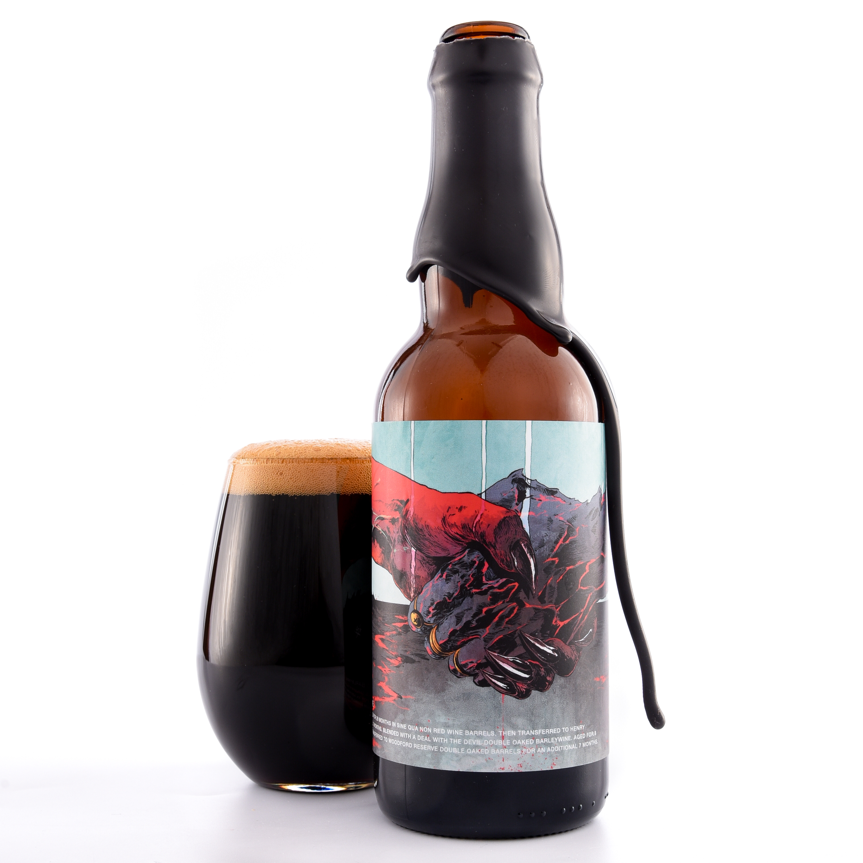 A Deal with Evil is a stunning blend of each brewery's Barleywine. Evil Twin shared their Barleywine aged 28 months in Sine Qua Non Red Wine barrels, then aged in Henry McKenna 12 Year Bourbon barrels for another 12 months. Then they blended with Anchorage’s A Deal with the Devil, aged 8 months in Buffalo Trace bourbon barrels and 7 months in Woodford Reserve Double Oaked bourbon barrels. The results are breathtaking!