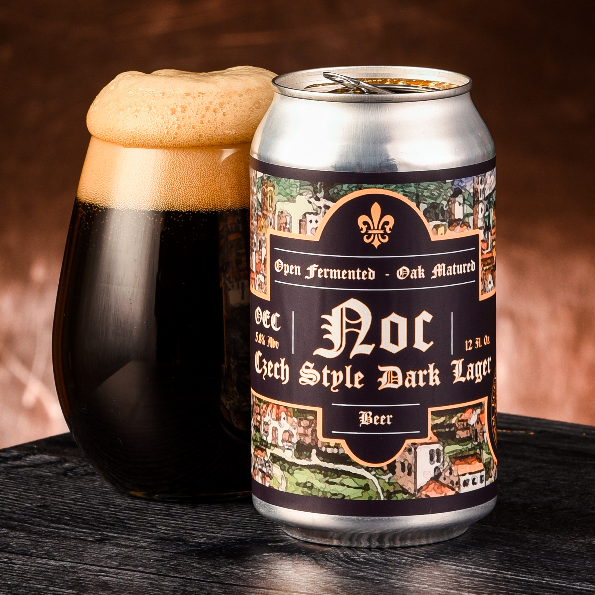 The OEC team brewed this carefully crafted, oak aged, Czech-style Dark Lager with Czech Pilsner, Cara Munich and Carafa III Special malts, using a double decoction to give the brew excellent flavor and body. European Noble Hops, open fermentation, and lagering in oak add delicious depths to every easy drinking mouthful.